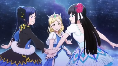 Taylor Alatorre: The first season of Love Live! Sunshine!! might as well be titled Love Live! The Agony of Influence!!. The show goes to such great lengths to stress how indebted the girls of Aqours are to their predecessors in µ’s that at times it resembles a big-budget fanfic. Eventually the group realizes the need to compartmentalize their hero worship and forge a path of their own, setting the stage for a less referential second season (which is still on my to-watch list). If “Water Blue New World” is any indication, the weight of history isn’t something that goes away with a few motivational speeches. The drama, the missteps, the lessons learned and the hard-won successes all find expression here, with key changes that underline the escalating stakes that these girls from a rural seaside town have chosen to take on. As a series wrap-up it serves its purpose, but as a song it feels a bit didactic, like a coronation single from an early season of American Idol. Maybe the writers overcorrected for the slightness of the winning µ’s song, which was anticlimactic enough that they had to re-enact an established classic as an encore. Still, it’s hard to write an actual dud using the patented Love Live! formula. The vocal performances here, neatly grouped by grade level and sub-unit as a way of grounding individual showmanship in the bonds of kinship, are worthy of that sea of glow sticks.