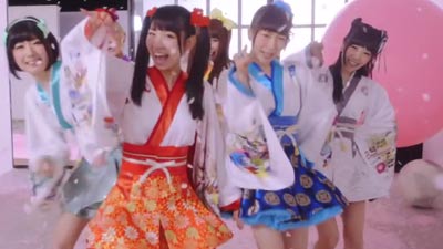 Patrick St. Michel: “Sakura Apparition” is a clever bit of two-way marketing. As Dempagumi.inc have attracted just enough attention outside Japan to make money signs flash in management’s eyes, it serves as an international introduction — they spell out who they are (literally), shout out homebase Akihabara and cover a lot of spiritual bases by singing “God, Buddha and Mr. Rabbit.” Domestically, it’s a seasonally appropriate “sakura song,” typically a song released to coincide with kids graduating from school and people changing jobs. Those cash-ins, though, are usually drippy and depressing ballads. Dempagumi have no time for that — whether its because they all allegedly come from typically nerdy backgrounds (one member saying she was a hikikomori) or just because being needlessly sad stinks, they zip all over the place here. Whereas other J-pop acts practically scream I AM SERIOUS, they are playful — imitating grocery store clerks, shouting out “justice!”, or taking a break midway through to pretend it’s summer festival season. “A nonsensical documentary/that’s the fantasy we grasp at,” captures it well, though not quite as solidly as the constant invocation to “dance.” And here, they spin away from the idea that the best times have already passed, instead throwing caution to the wind and embracing ambition (this is the first Japanese song since “Invader Invader” to be so determined in itself). What Dempagumi sells here for everyone is the idea tomorrow can bring personal happiness: “I’ll brighten up your future, it’s a cinch!” Don’t mind if I do.